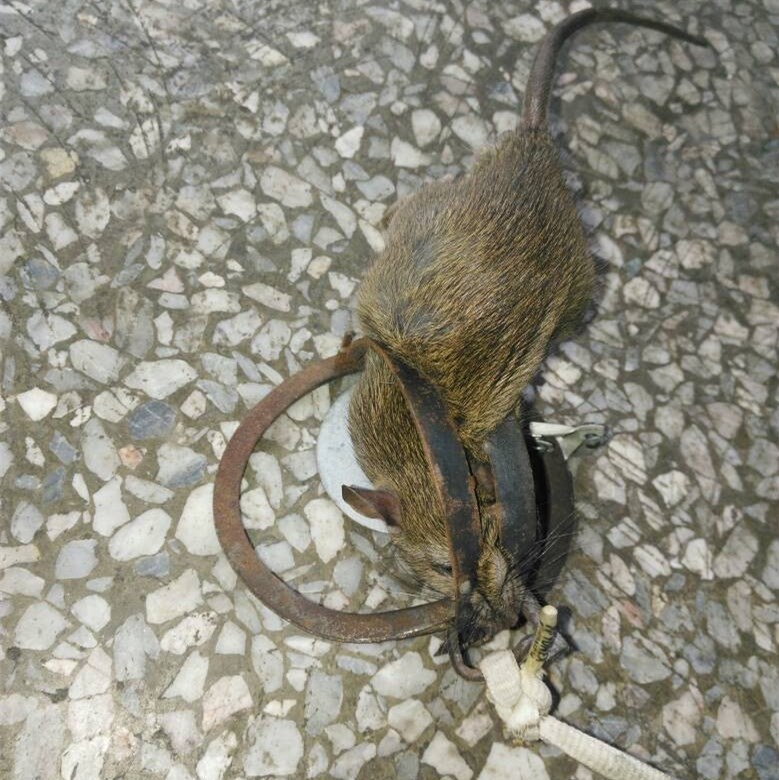 (3)放夾時要注意自身安全,壓簧桿掛上之后,手始終不要接觸前端(夾老鼠的那端)。鼠夾放好后不得有人在現(xiàn)場走動,鼠夾要晚放晨收,專人負責。在可能情況下,捕到老鼠后馬上重新放置。收夾時最好拿根棍子敲擊未捕到鼠、上弦待發(fā)的夾子,使壓簧桿復(fù)位后再用手撿。