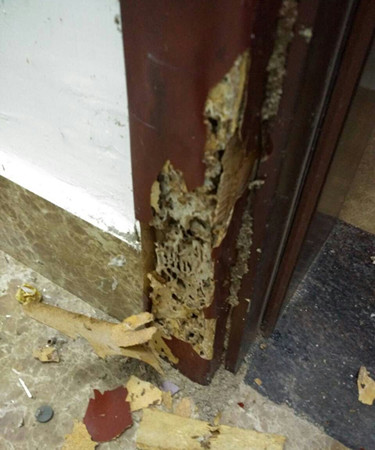 當日,李師傅在張女士家中發(fā)現(xiàn),她家里的木質(zhì)家具較多。據(jù)介紹,她入住該房屋才兩年時間,前幾日中午回到家時,不經(jīng)意間用手觸摸到自家房門套表皮,感覺有點異樣,用手指使勁一摁,居然癟了下去。接著撕開門套表皮發(fā)現(xiàn),一大堆白蟻正在啃噬著門框,嚇了張女士一大跳。